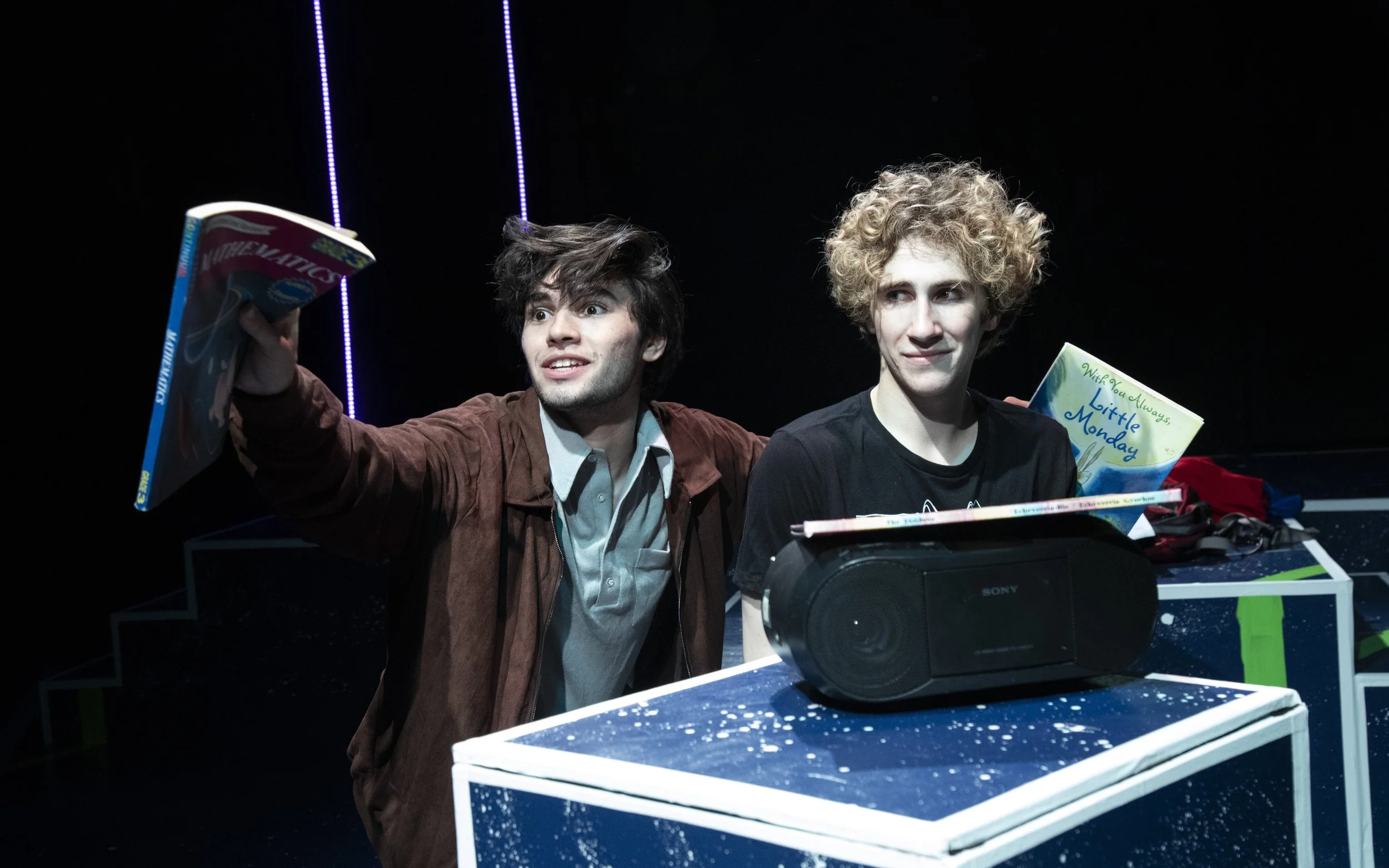 Two young men sitting at a table in a dark room with neon lights, one holding a book (Joel Morel), the other looking at the camera in a theatrical scene.