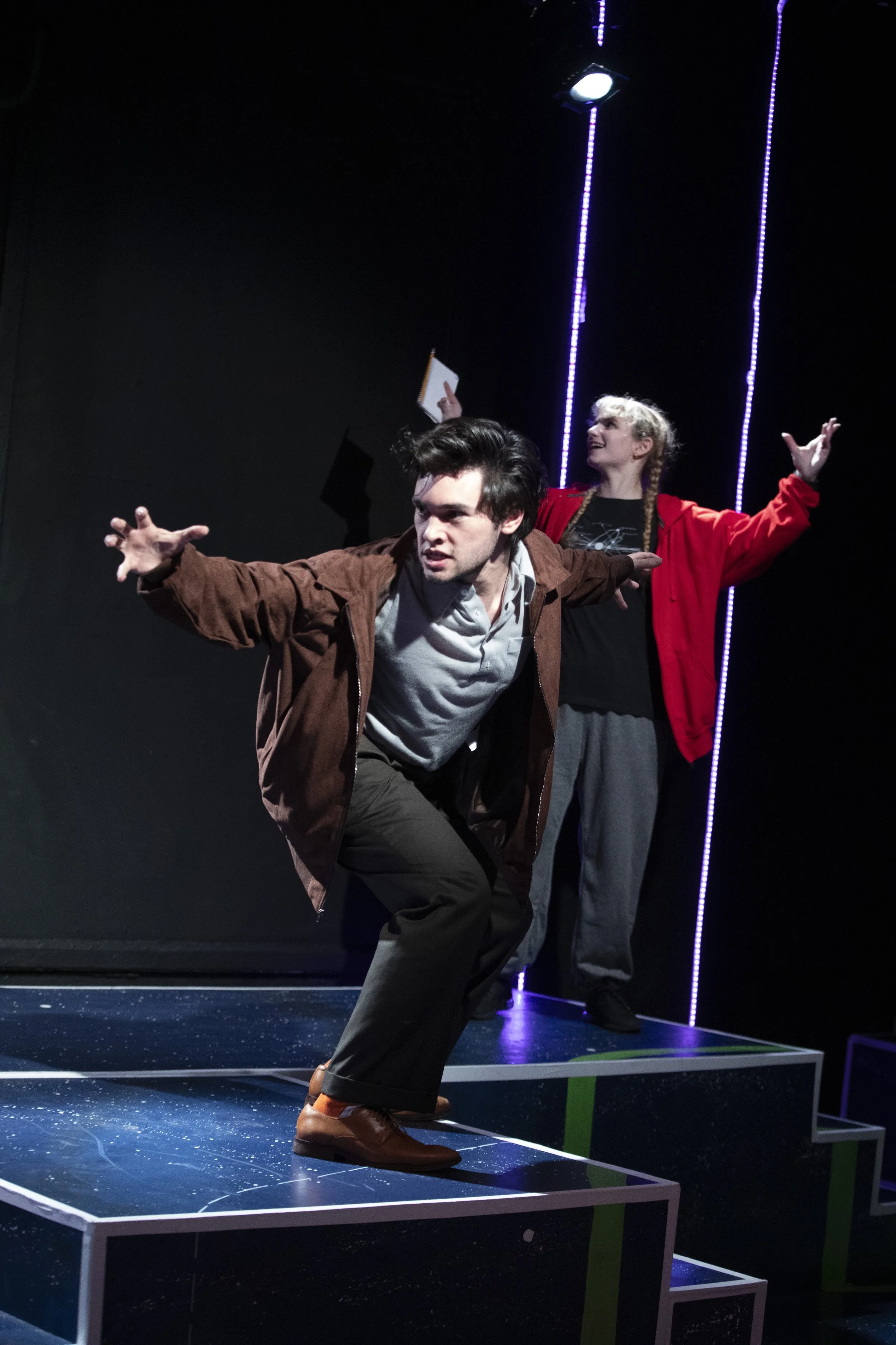 Two actors perform on a black stage with blue LED strip lights. One actor, in a brown jacket and gray pants (Joel Morel), crouches with outstretched arms. The other actor, in a red jacket and gray sweatpants, stands behind, raising hands and smiling.