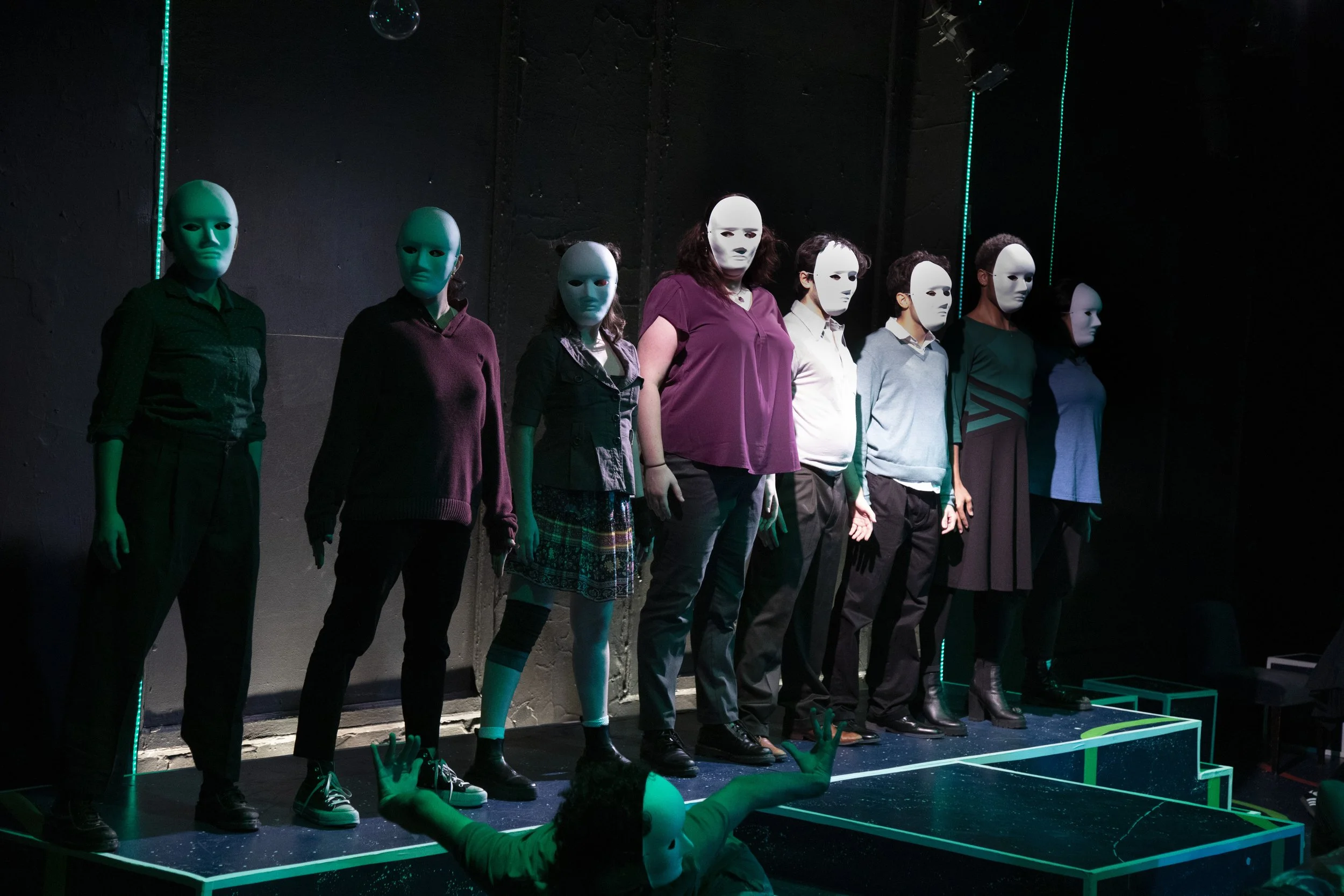 Group of people standing on stage wearing white masks, with a performer wearing a mask and reaching out in front of them, dark background with green vertical lights.