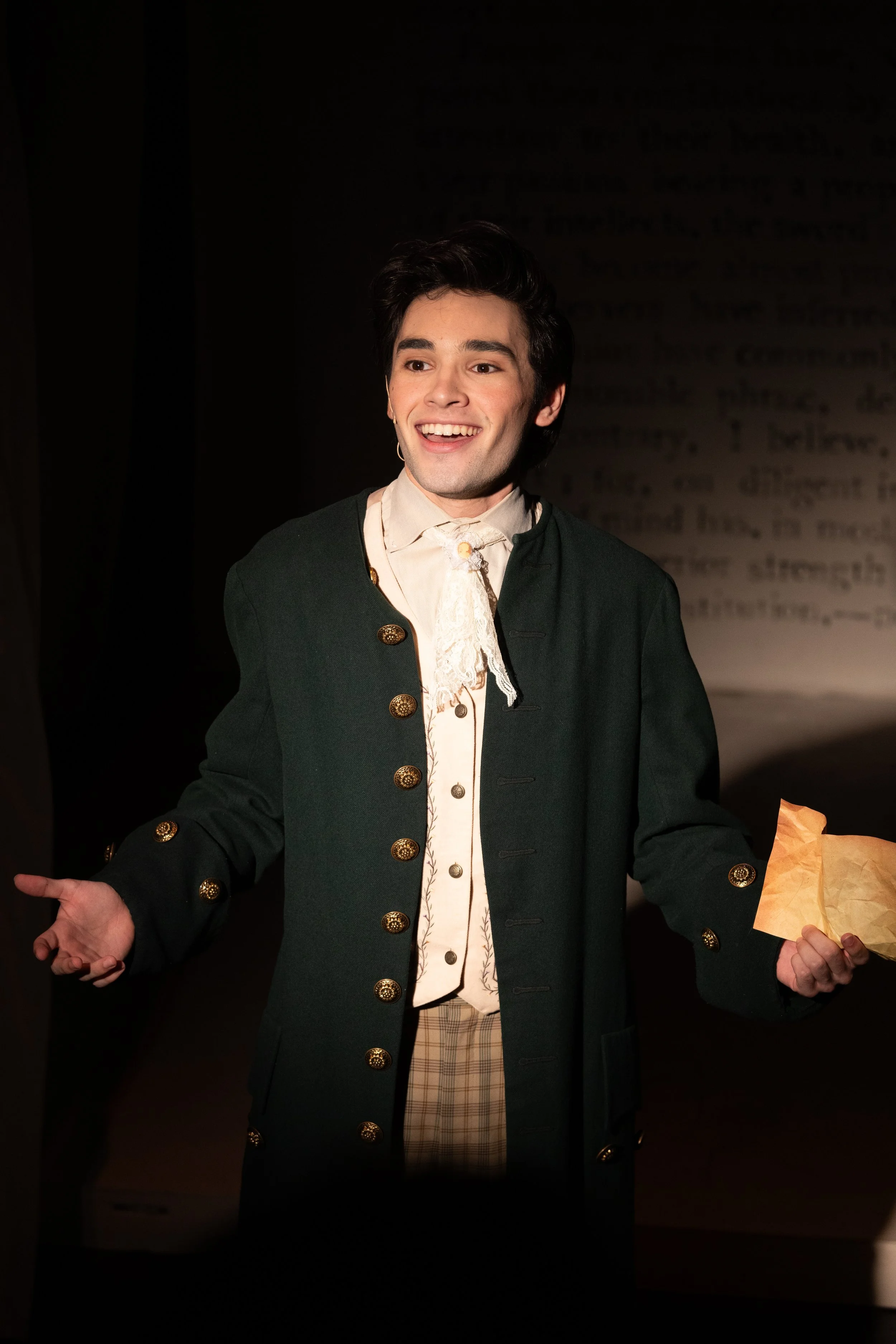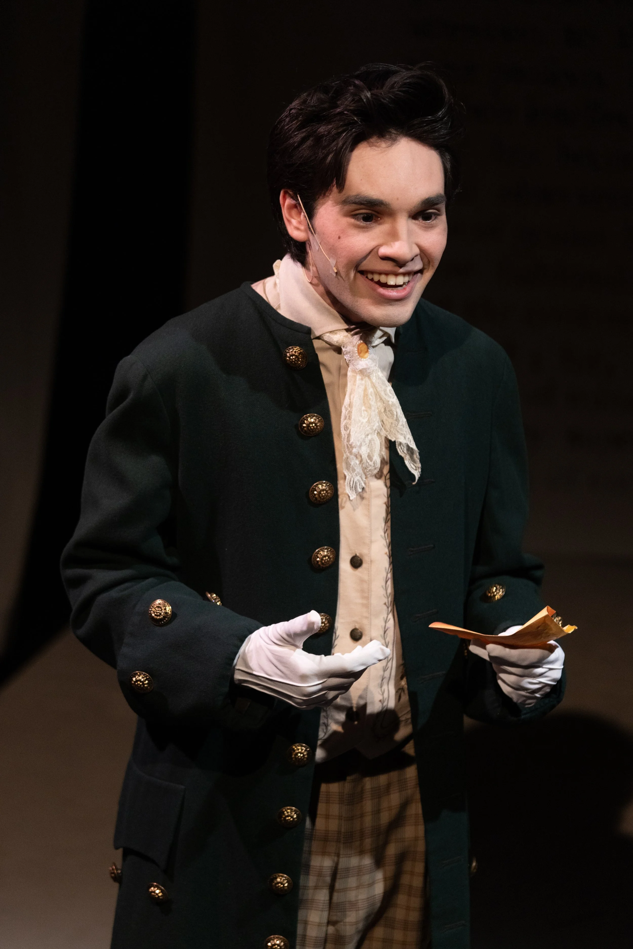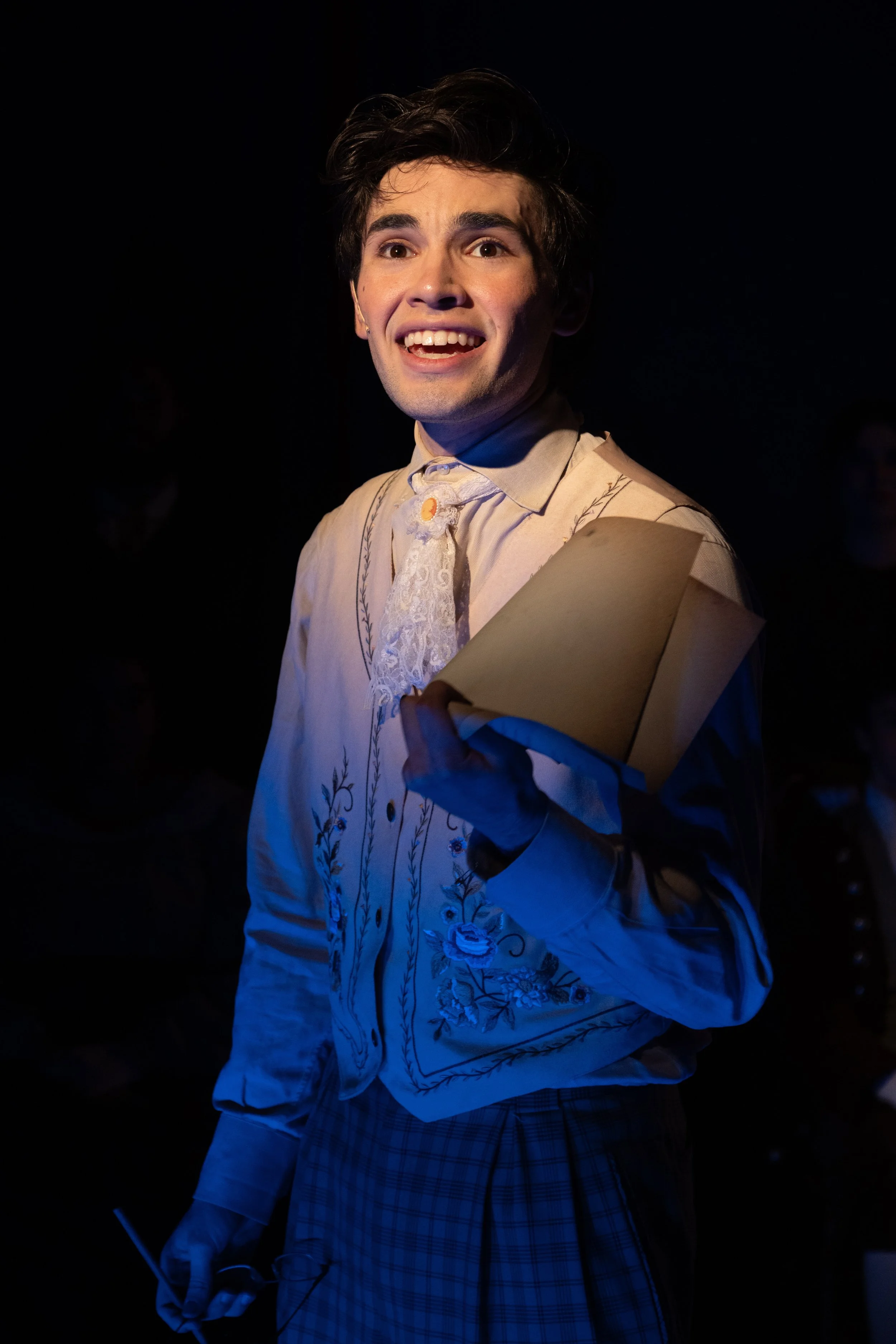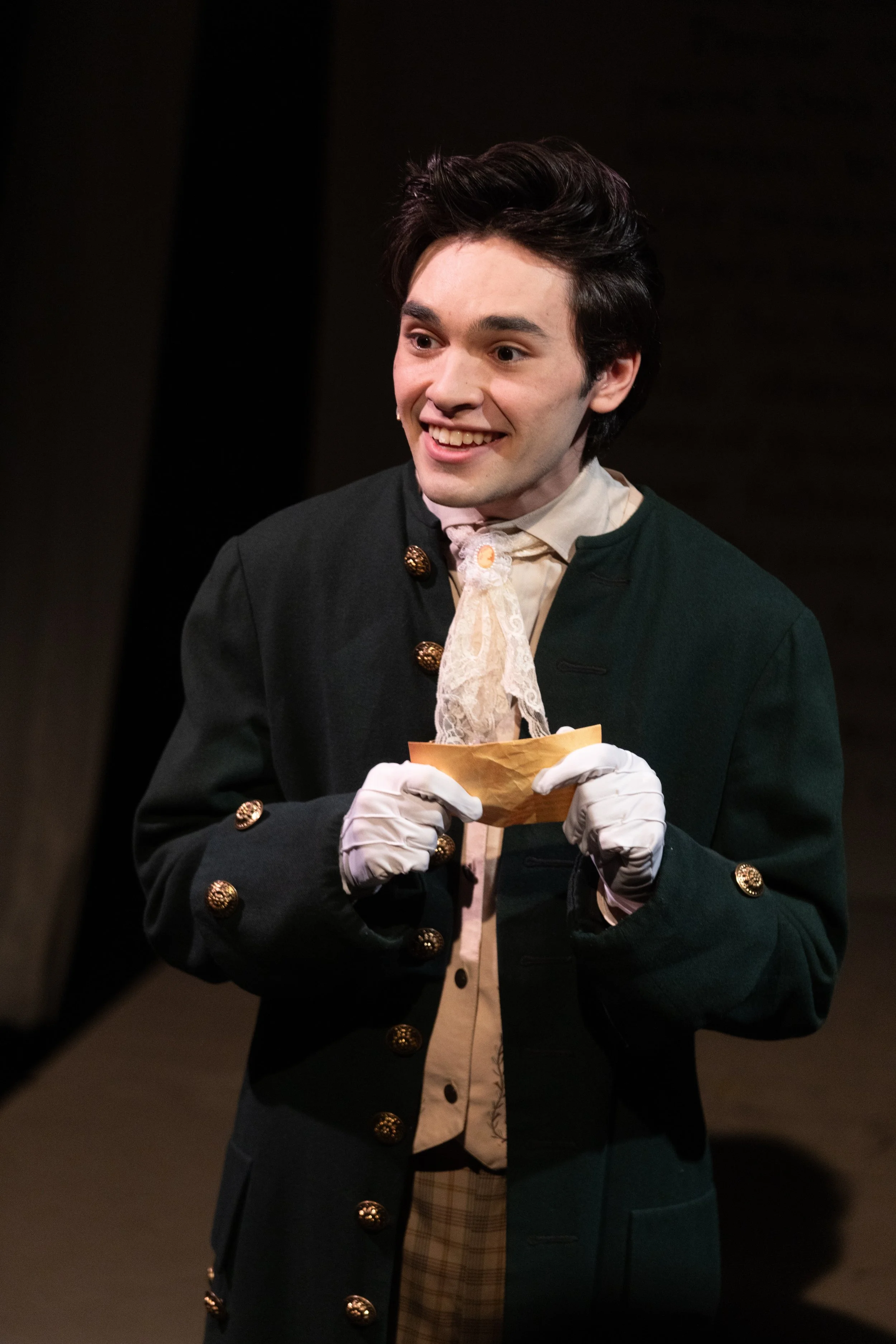 A young man (Joel Morel) dressed in historical costume, smiling, holding a letter or paper, on stage. He is wearing a dark coat with gold buttons, a lace cravat, and white gloves.