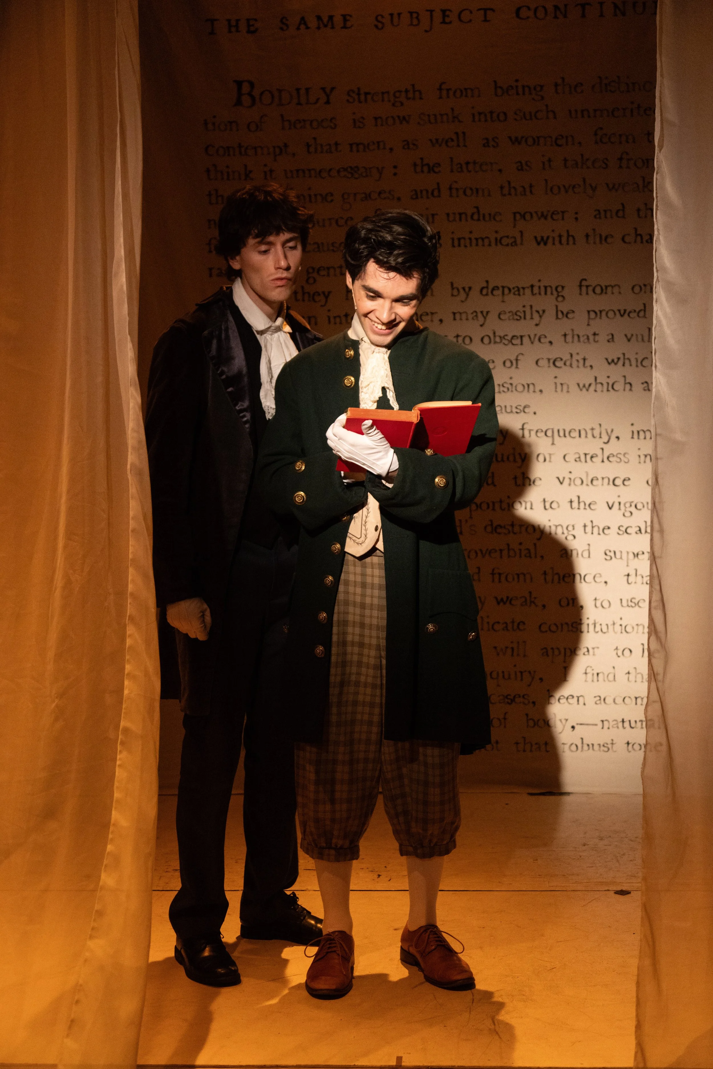 Two actors on stage perform in a play; a woman dressed in 19th-century clothing looks at a man (Joel Morel) holding a notebook and pen, who is also dressed in period costume with glasses.