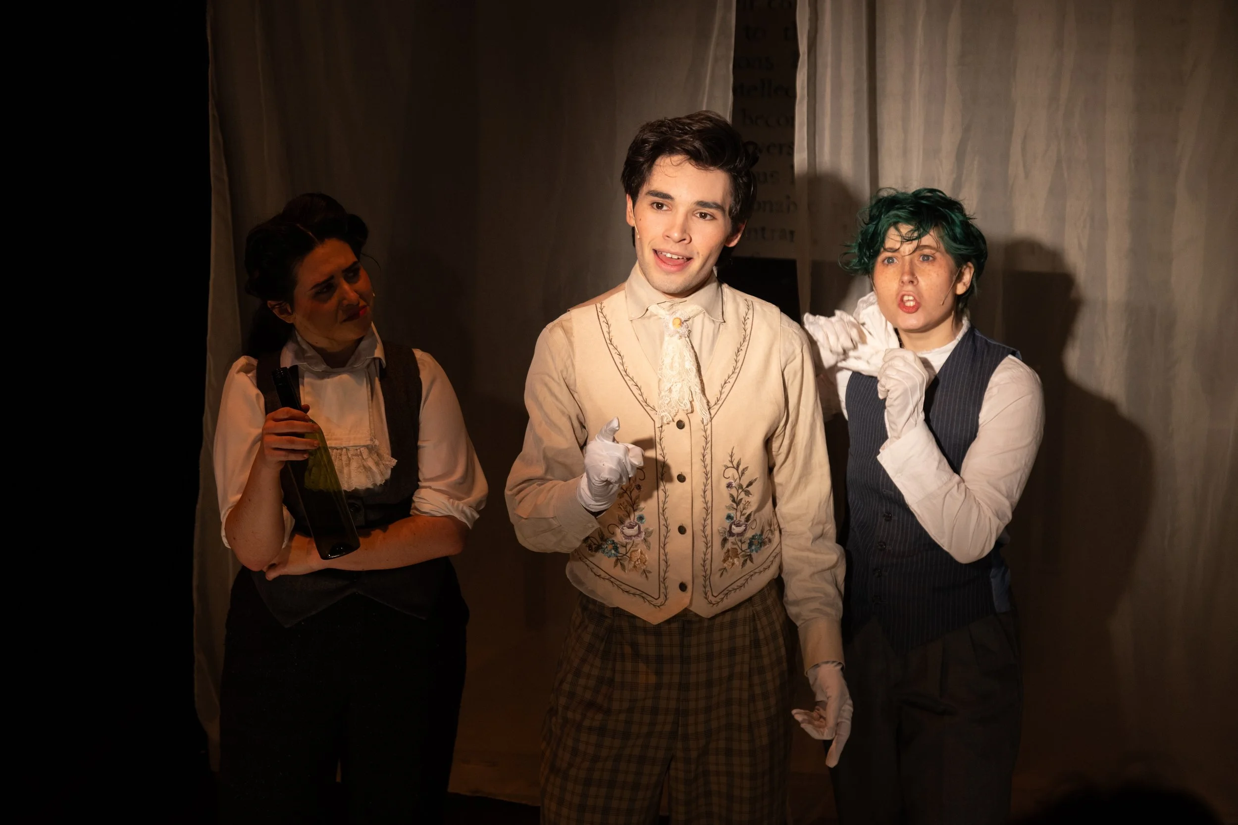 Three young actors performing in a theatrical play, dressed in period costumes, on stage with a dark background.