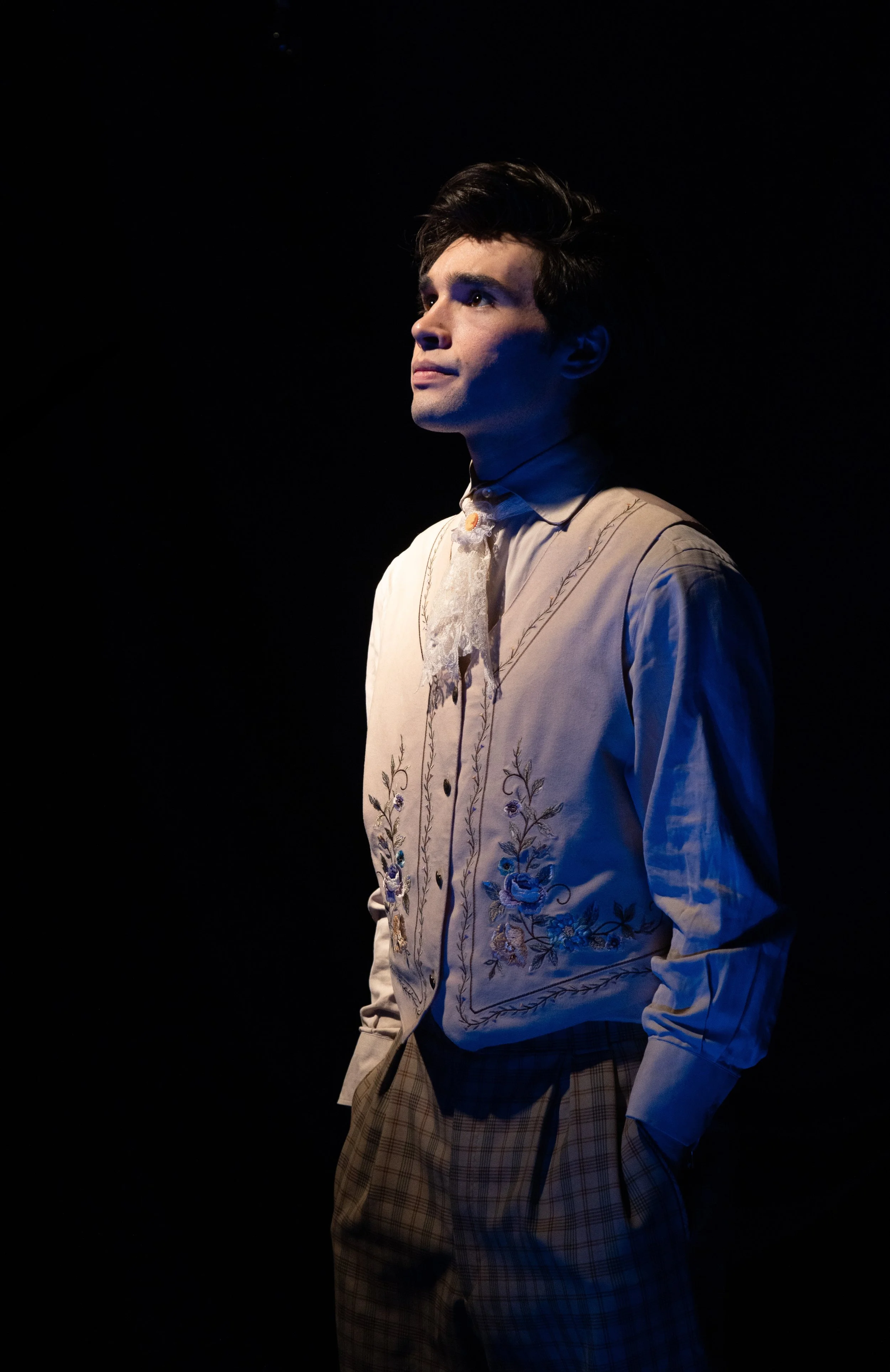 A young man (Joel Morel) with dark hair dressed in historic costume, wearing a dark coat with gold buttons, a lace cravat, and gloves, appears to be performing on stage with a smile.
