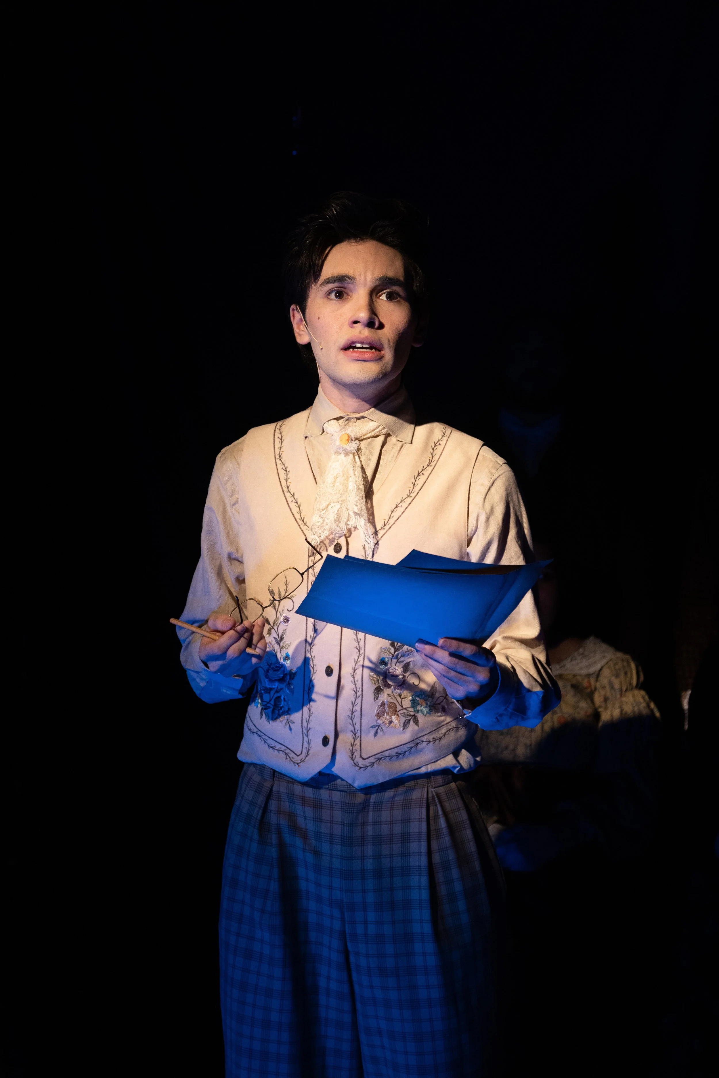 A young man (Joel Morel) in vintage costume holding a script and a pair of glasses, performing on stage with a dark background.